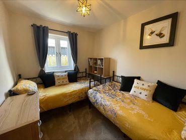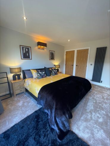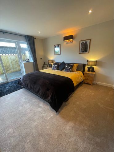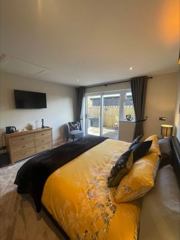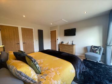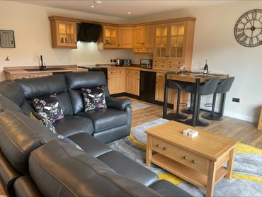 Bumblebee Barn has a large well equipped oak shaker style kitchen consisting of a gas oven, grill and hob, a modern extractor, fridge, freezer, dishwasher, toaster, microwave, kettle and Dolce Gusto coffee pod machine. It contains ample plates, pans, cutlery, mugs and glasses, as well as the necessary cleaning equipment needed for your stay. Adjacent to the kitchen is a modern dining table and quilted adjustable bar stools for you to enjoy your meals. The lounge area has a large Italian leather 5 seater corner suite which has end recliners. Here you can sit back while watching a large flat screen smart TV and DVD player with ample dvds to choose from. Large patio doors lead out to the outside area which is completely secure for children. There is a patio table and chairs along with a bbq area for portable/disposable bbq's.